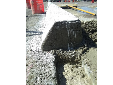 Curb is extruded over a 1.5-2" Deep x 5" Wide Keyway with tack applied for asphalt paving (adhesive for concrete). We use a low-slump 4500 psi fiber reinforced Class B Mix. Carbon Dioxide is reduced 44% on new projects and 73% for retrofitting applications.